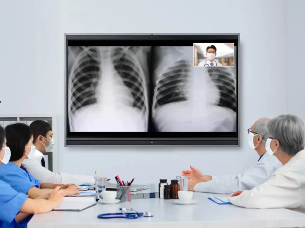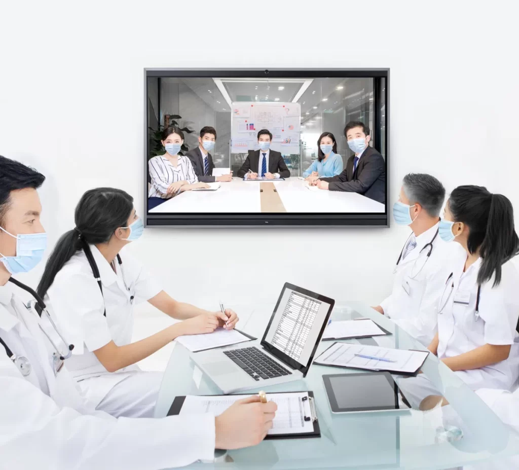 以医院各科室、会议室等场所为场景,使用搭载了智能会议系统的 TCL 远程医疗协同智慧交互平板,建立远程会议节点。 后期可分阶段在各市县医院的科室中建设同级别的远程会议能力,全面提升区域医疗协同能力和内部交流培训水平。