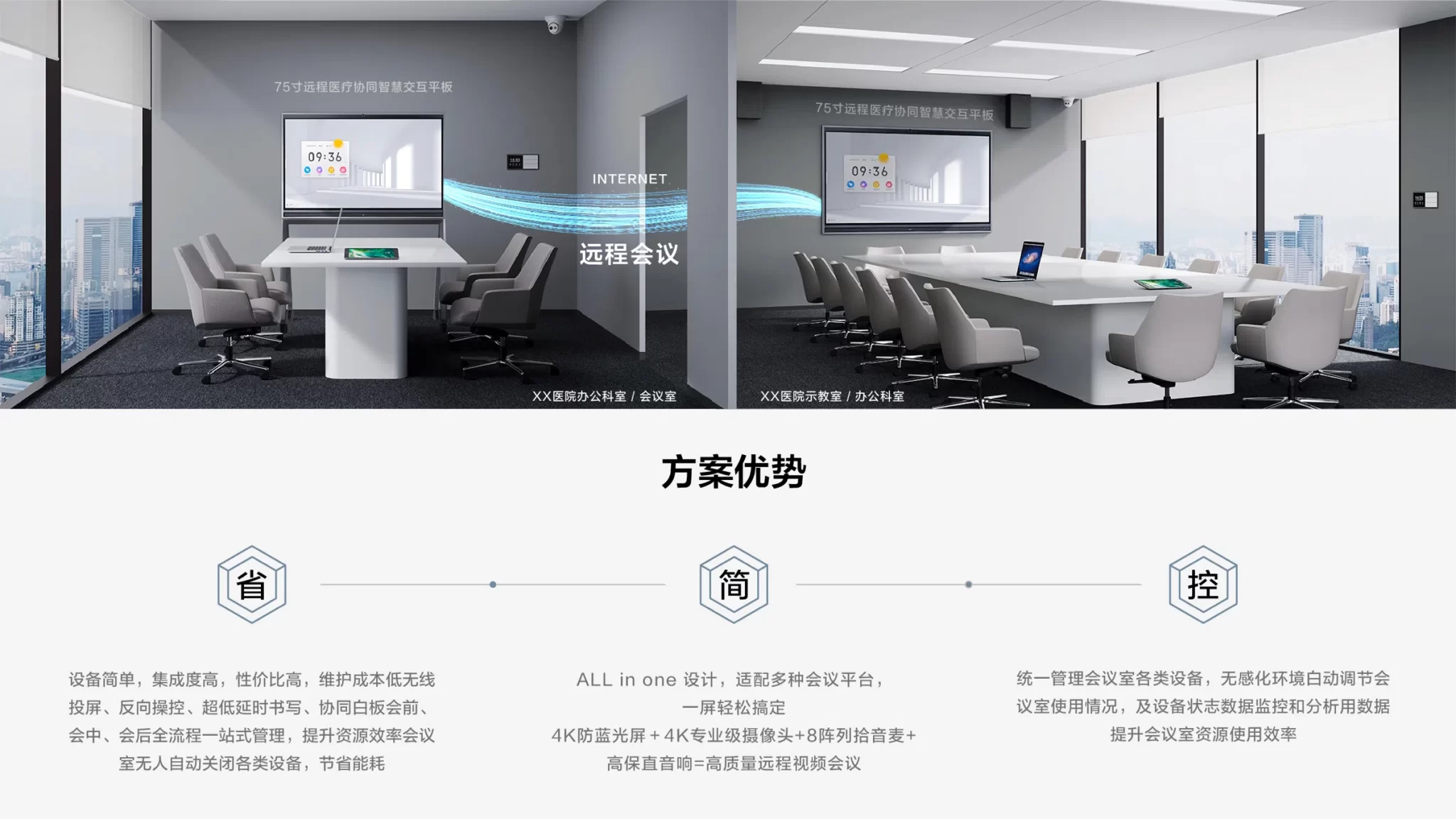 医院科室办公室和示教室目前仍是医院智能化的盲区,但又是医生间进行内部培训和外部交流研讨的重要场景,尤其是近几年全球疫情常态化的背景下,医生工作量增大,线下交流难度加大,为了确保区域间医疗水平的均衡,对于远程视频会议的需求大幅增加。